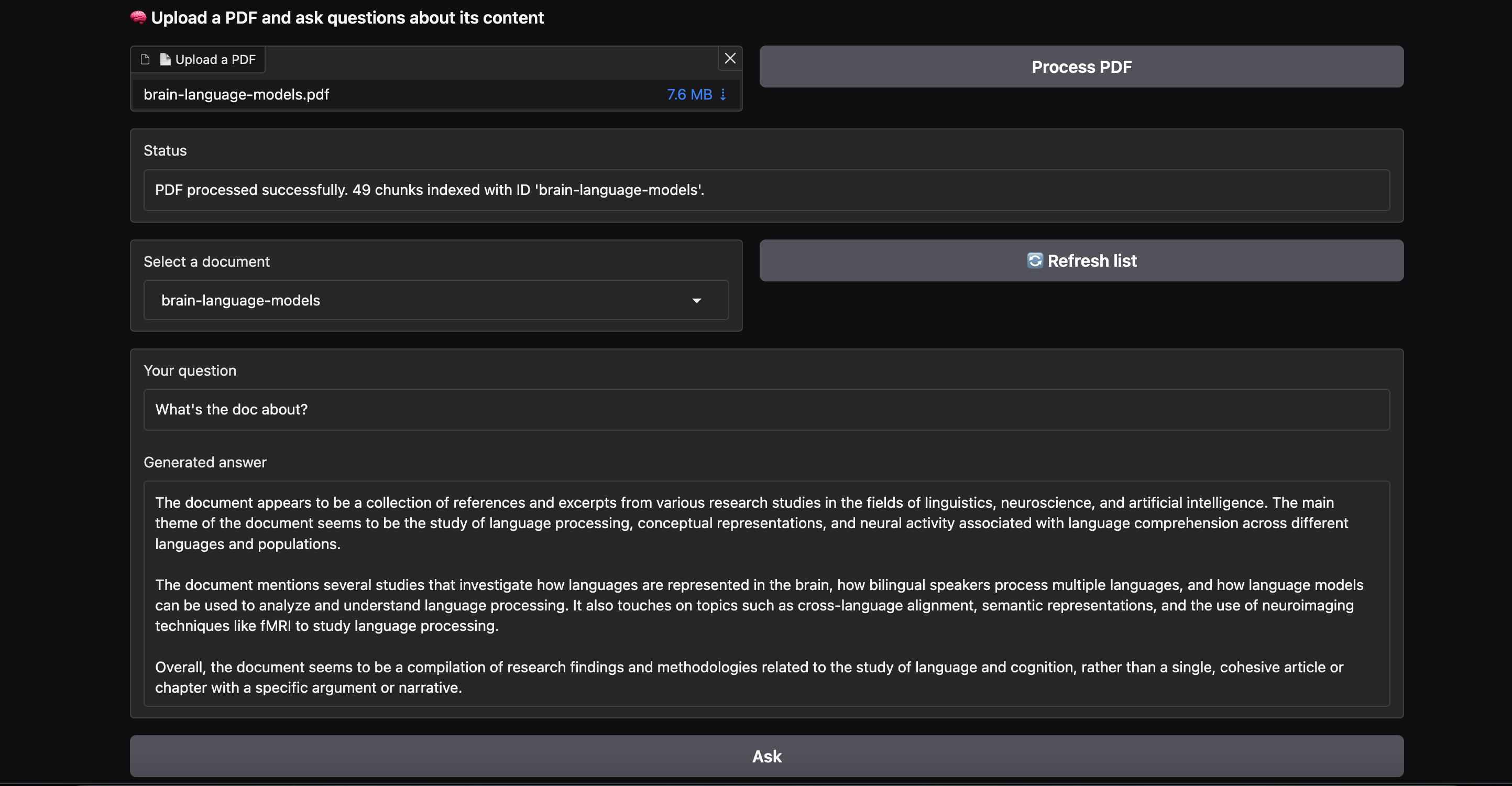 PyMuPDFand processing viaspaCy. - Real-time Feedback: Progress bars for indexing and interactive Q&A.